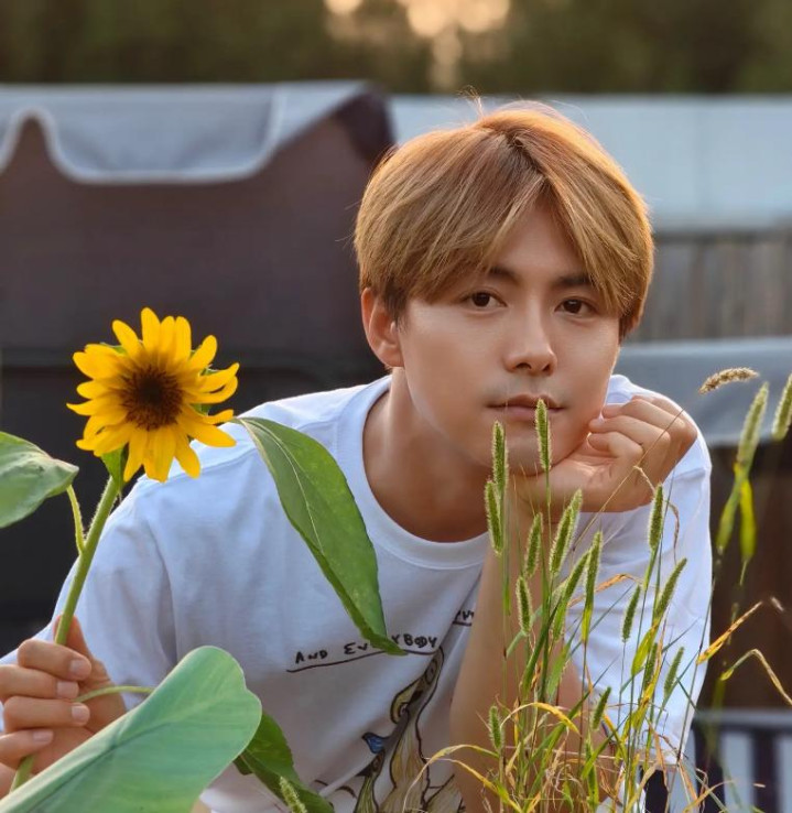 他身穿印花白短袖,下身搭配了一条蓝色休闲裤,简单且干净。